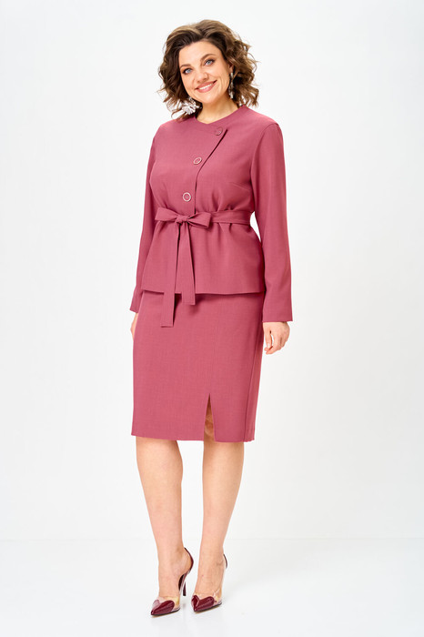 Костюм женский двухпредметный, состоящий из жакета и юбки. Жакет полуприлегающего силуэта со слегка спущеной линией плеча, на подкладке, со смещенной застежкой на 3 пели-пуговицы по линии борта 1 потайной петлей-пуговицей и нагрудными вытачками, выходящими из боковых швов. Горловина с фигурной планкой по переду и спинке. Спинка со средним швом. Рукав втачной длинный двухшовный. Изделие со съемным поясом. Юбка- карандаш длиной за колено, зауженная к низу, с кокетками со шлевками. Переднее полотнище с имитацией карманов и рельефным швом, заканчивающимся разрезом. Заднее полотнище со средним швом, в котором обработана застежка на 2 петли-пуговицы по кокетке и потайная тесьма-молния.