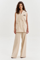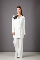 Костюм женский двухпредметный, состоящий из жакета и брюк. Жакет полуприлегающего силуэта с центральной бортовой застёжкой на две петли-пуговицы и подрезом фигурным от бокового шва, переходящим в нагрудную вытачку. В подрезе обработан карман с листочкой. Спинка со средним швом. Воротник фантазийной формы - в виде подреза, переходящего в стойку. Рукава втачные, двухшовные. Брюки с притачным поясом, по задним половинкам вставлена резинка. Застёжка на тесьму-молнию в среднем срезе и одну петлю-пуговицу по поясу. Брюки слегка зауженные к низу с наклонным карманом из бокового шва и заутюженными стрелками. Длина жакета по спинке - 67,5 см. Длина рукава - 61 см. Длина брюк по боковой части - 99 см.