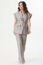 Костюм женский состоит из жакета и юбки. Жакет полуприлегающего силуэта с естественной линией плеча. Спинка со средним швом и рельефами из плеча. Перед с рельефами из плеча, с накладными карманами. Застежка центрально-бортовая на петлю-пуговицу. Воротник отложной пиджачного типа. Рукав втачной длинный. В локтевом шве рукава обработана отлетная шлица с отделочными пуговицами.