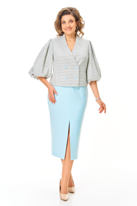 Жакет полуприлегающего силуэта на подкладке, укороченный. Застежка двубортная на петли-пуговицы. Перед с рельефом из проймы и нагрудной вытачкой. Перед выполнен с цельнокроеной стойкой переходящей в горловину спинки. Рукав втачной одношовный типа "баллон", с декоративными складками по окату и низу.