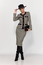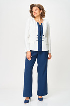 Комплект женский, состоящий из блузки и брюк. Блуза (состав: 61%район, 39%вискоза) выполнена из ткани с тонким шёлковым блеском - мерцает при движении. Блуза свободного силуэта с вырезом горловины в виде «лодочки». Спинка без особенностей. Низ ассиметричный с разрезами в боковых швах от низа. Рукав в блузе втачной на подкладке, в виде буфа, с залаженными декоративными складками по окату и низу. В комплекте идёт пояс из основной ткани. Брюки (состав: 60% полиэстер, 40% полиуретан) прямого силуэта из кожи с рельефами и отстрочкой по переду. По переду застежка на тесьму молнию в гульфике и пуговицу в поясе. По переду брюк наклонные карманы. Пояс притачной со вставкой эластичной тесьмы резинки в «бочках», что обеспечивает комфортную посадку на фигуру. Длина блузы 76,5 см (р 50-54), 77 см (р 56-60), длина рукава 37/45 см. Длина брюк по боковому шву от пояса 98 см.