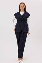 Блузка свободного силуэта с центральной потайной застёжкой на петли пуговице по планке, воротником рубашечного типа. В качестве дополнительного декоративного элемента по планке идет кант из отделочной ткани и декоративная брошь «цветок». Спинка в блузке со средним швом. Рукав втачной, длинный с заложенными складками по низу. По низу рукава манжета с застёжкой на петли пуговицы. Низ в блузке закруглённый, ассиметричный. Брюки свободного силуэта, широкие с притачным поясом на резинке для максимально удобной посадки на любой тип фигуры. Застежка на тесьму молнию в гульфике и пуговицу по центру переда. По переду брюк прорезные карманы. Пояс в брюках притачной.Длина блузки от высшей точки плечевого шва до низа 76,5 см(р.52-56), 77,5 см (р.58-62). Длина рукава от головины с плечом и манжетом 74 см(р.52-56), 75 см (р.58-62). Длина брюк по боковому шву от шва притачивания пояса 108 см.