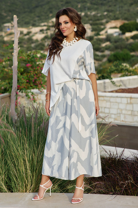 Летний комплект представляет собой гармоничное сочетание стиля и комфорта. В таком комплекте каждая деталь безупречно дополняет другую, создавая образ, который одновременно привлекает внимание и дарит ощущение комфорта. Этот наряд идеально подойдет как для прогулок по городу, так и для более камерных мероприятий, позволяя женщине чувствовать себя уверенно и очаровательно в летнее время. Блуза свободного силуэта гармоничном сочетании однотонного материала и декоративных вставок из ткани с принтом. Горловина в блузе округлой формы, по переду и спинке рельеф выходящий из проймы, по переду нагрудная вытачка. Рукав втачной с притачной с притачной манжетой с декоративным разрезом (рукав ассиметричный —левый из ткани с принтом, правый однотонный со вставкой в подрезе декоративного канта). Низа в блузе ассиметричный с декоративной треугольной вставкой по низу. Брюки-кюлоты свободного силуэта, длиной 7/8 расширяются к низу. Пояс притачной со вставкой эластичной тесьмы-резинки в задней части пояса, которая обеспечивает максимально удобную посадку на любой тип фигуры. В боковом шве застёжка на потайную тесьму-молнию и пуговицу в поясе. По переду кюлот из бокового шва отлетная деталь, фиксируется у пояса при помощи пряжек-полуколец. Длина блузы 61 см, длина рукава 40 см (р 52-56), 41 см (р 58-62). Длина брюк 92 см.