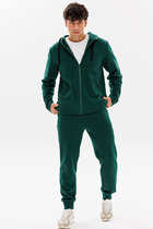 Костюм мужской из ткани высокого качества. Кофта на молнии, ворот-стойка, рукава-реглан. Рукава на манжете, сбоку по рукаву до локтя цветная вставка с печатью. Спереди на кофте два кармана на молнии. Слева на груди печать-надпись. Брюки на манжете. Спереди два кармана на молнии, один сзади без молнии. Сбоку на брюках до колена цветная вставка с печатью.