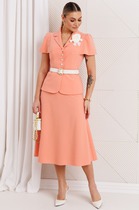 Костюм женский из фактурного полотна, свободного силуэта, состоящий из блузки-топ и юбки. Блузка-топ без застежки, с задним средним швом и фигурной горловиной. Юбка с боковыми карманами, на притачном поясе с отстроченной эластичной тесьмой. На переднем полотнище юбки заложены складки.