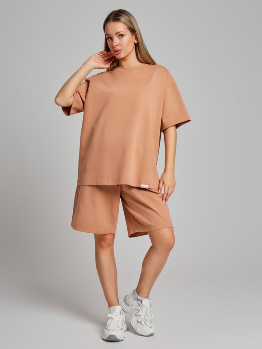 Костюм женский из плотного гладкокрашеного трикотажного полотна "кулирка", состоящий из футболки и шорт. Футболка - свободного покроя, с удлиненными плечевым и швами, короткими втачными рукавами и горловиной овальной формы, обработанной втачной планкой. В нижней части переда слева настрочен декоративный элемент прямоугольной формы. По горловине проложена отделочная строчка. Шорты - классического покроя, на притачном поясе с эластичной тесьмой внутри и карманами в боковых швах. Для регулирования степени прилегания шорт по талии в пояс вставлен шнурок, продетый через два отверстия в соединительных швах в центре пояса.