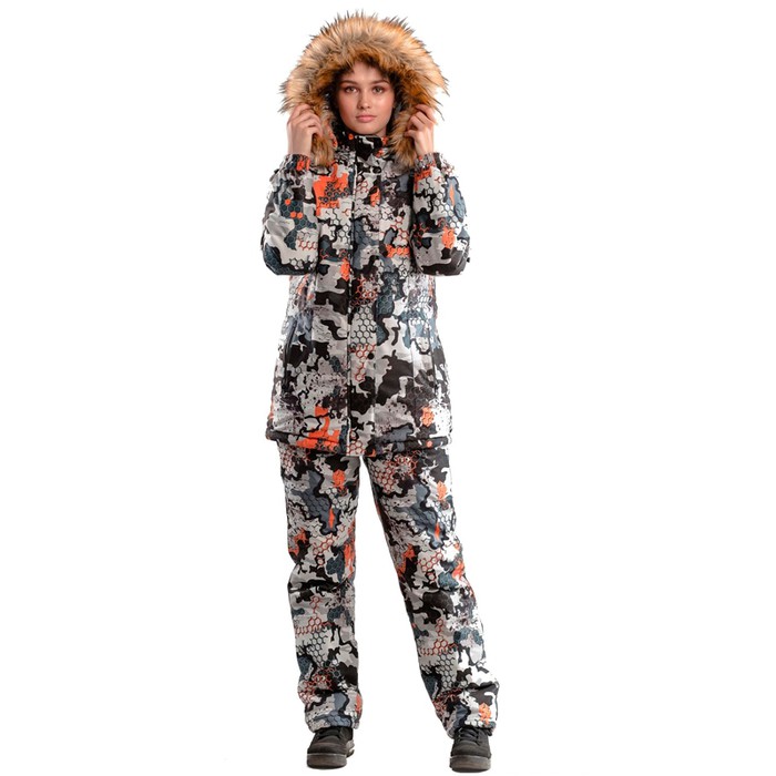 Костюм женский зимний Кайра выполнен из не шуршащей мембранной ткани. Подкладка выполнена из полибрушета. Куртка приталенного кроя с утяжками в зоне талии и снизу. Куртка с застежкой на молнию и ветрозащитной планкой на кнопках. На куртке имеются три кармана: один внутренний на молнии и два нижних кармана на водонепроницаемой молнии, утепленные полибрушетом. Опушка капюшона съемная на молнии. Капюшон также съемный на молнии, регулируется резинкой с фиксаторами. Воротник - стойка, выполнен изнутри из полибрушета. Манжеты на рукавах на резинке. В куртке используется двойной слой утеплителя (плотность 150+150) и полибрушет.
