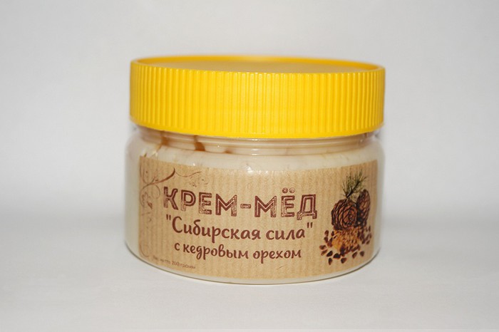Состав — крем-мед, очищенное ядро кедрового ореха. Не содержит ГМО. Цвет - белый. Консистенция кремообразная. Пищевая ценность 100гр продукта: углеводы не менее 75гр. Энергетическая ценность 284ккал (1189кДж) Хранить при t от 0 до 20 С и относительной влажности не более 75%. Срок годности 2 года. СТО 67594434-001-2012. Дата изготовления смотри на этикетке. Продукт готов к употреблению.