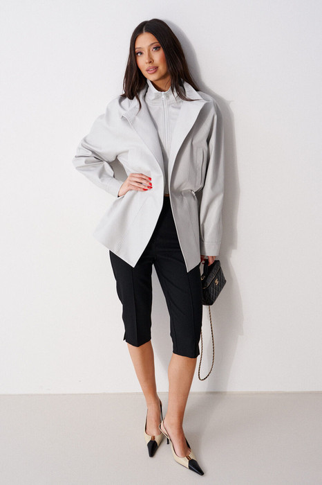 Куртка свободного кроя выполнена из эко-кожи серого цвета. Характеристики: подкладка, воротник-стойка, рукав реглан с манжетом, внутренняя часть изделия - манишка с центральной застёжкой - молнией, основная часть изделия с прорезными карманами с листочкой, по линии талии - резинка, с кулиской, с фиксаторами. Длина рукава от горловины 79 см. Длина спинки 73 см.