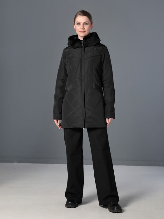 Удлиненная демисезонная куртка полуприлегающего силуэта подходит для девушек и женщин разной возрастной категории. Застежка - на двухзамковую молнию, которая позволяет расстегнуть куртку как сверху, так и снизу, регулируя тем самым ширину шага по необходимости.  Воротник - уютная стойка, переходящая в капюшон. Длину втачного рукава можно регулировать посредством отворота. Вместительные прорезные карманы, удобно расположенные в подрезах, застегиваются на кнопки. Есть внутренний кармашек на молнии. Отворот капюшона выполнен из мягкого эко-меха, который хорошо стирается на рекомендованном режиме и не меняет свой внешний вид после высыхания. Плащевая ткань, из которой выполнено изделие, имеет водоотталкивающую пропитку, выдерживающую небольшой  дождь, снег и ветер. Хорошо зарекомендовавший себя утеплитель "Холлофайбер", плотностью 200гр/м, защитит от холода. Подкладка в изделии выполнена из ткани в мелкую полоску.
