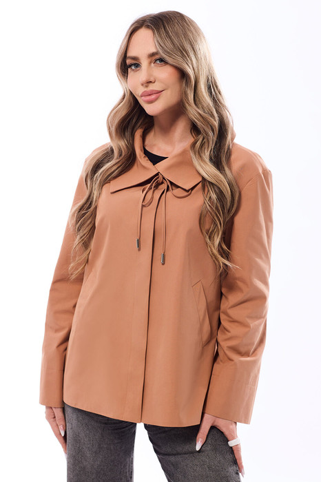 Куртка, с центральной застежкой на кнопки, отложным воротником. Воротник с кулисой и шнуром. По переду расположены прорезные карманы с листочками. Рукав втачной. Плечо спущенное. Спинка со средним швом.
