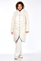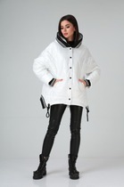 Куртка на стойке с застежкой на металлическую молнию (с двумя бегунками), молния закрыта вертикальной планкой с металлическими кнопками. Перед с вертикальными рельефами, в рельефах выполнены карманы с листочками. Спинка чуть длиннее переда, с кокеткой и средним швом, по центру кокетки пришито декоративное украшение. Рукава втачные, свободные (внутри на притачной манжете из вязанного трикотажа).