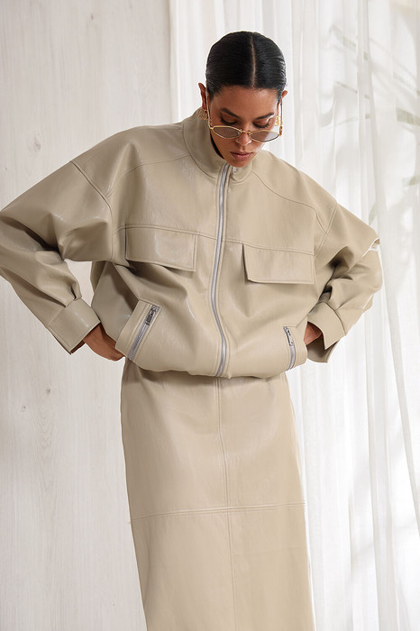 Мега стильная, объемная, укороченная куртка   в стиле Casual, выполнена из мягкой экокожи, прямого силуэта, на вискозной авторской подкладке.  Изделие на молнии.   По переду прорезные карманы с листочками и декоративными молниями, горизонтальная фигурная кокетка, в которую вставлены декоративные клапаны.  По плечу фигурные кокетки, переходящие на спинку.  Спинка с фигурной кокеткой. Низ изделия на резинке.  Рукав спущенный, рубашечный, длинный.    Низ рукава на  манжете.  Воротник- стойка.  На спинке лого.