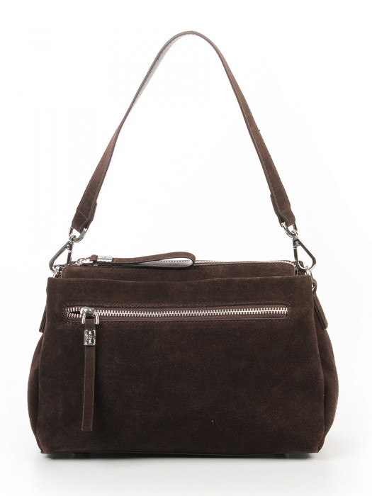 Сумка женская выполнена из натуральной замши. Детали: 1 ручка 45 см, 1 регулируема ручка от 110 см до 135 см. Каркас сумки: полужесткий. Сумка на ножках. Застежка: молния. Внутри изделия: 3 отделения, 1 карман на молнии, 1 открытый карман. Снаружи изделия: 1 карман на молнии спереди, 1 карман на молнии сзади. Подкладка из хлопка. Металлическая брендированная фурнитура серебристого цвета. В комплекте фирменный пыльник для хранения сумки.