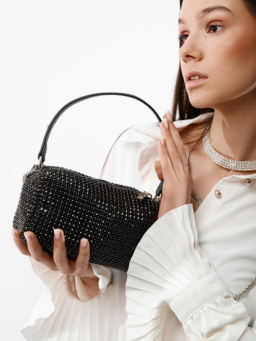 Сумка женская выполнена из текстиля, декорирована стразами, с элементами эко кожи. Детали: 1 короткая ручка 35 см, 1 длинный ремешок на плечо из цепочки 120см. Внутри изделия: 1 отделение на молнии, 1 открытый карман. Брендированная подкладка из хлопка. Металлическая брендированная фурнитура серебристого цвета. В комплекте фирменный пыльник.