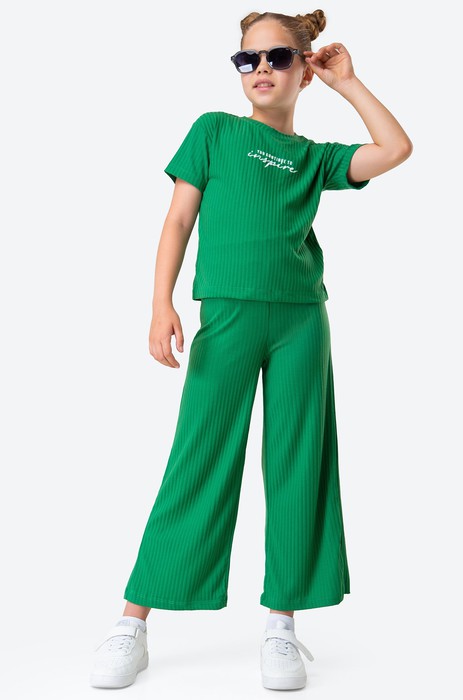 Летний костюм в рубчик для девочки и девочки подростка выполнен из фактурной ткани лапша. Трикотаж – легкий и дышащий, в нем будет комфортно даже в самый жаркий день. Детский костюм с брюками отлично держит форму, не вытягивается в коленях, а зеленый цвет сохраняет яркость даже после многочисленных стирок.
