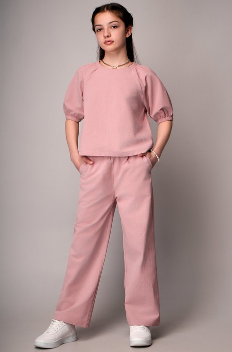 Детский костюм со штанами идеально подойдет как для прогулок и встреч с друзьями, так и для особых моментов, когда хочется выглядеть нарядно. Розовый костюм идеально впишется в трендовые весенние образы.Модель Любовь, ее рост 145 см, параметры: 68-56-74 см. На ней размер 152.