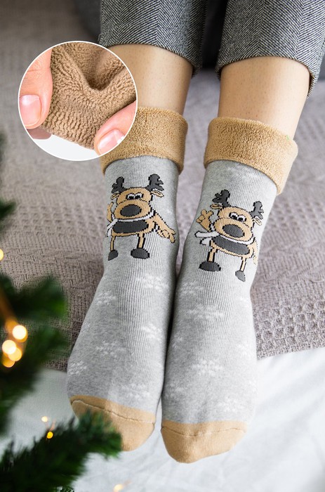 Женские носки с отворотом созданы, чтобы дарить комфорт в прохладные осенние и зимние дни. Махровые носки с новогодним принтом Олень и снежинки согреют и создадут атмосферу торжества.
