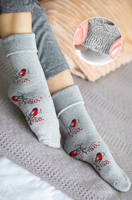 Махровые носки с новогодним рисунком Снегири выполнены из мягкой пряжи с высоким содержанием хлопка. Теплые носки с высоким бортом идеальны для уютных домашних вечеров.