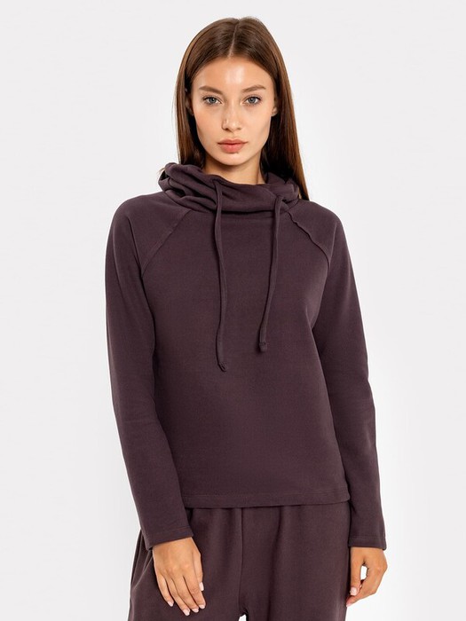 Домашний джемпер прямого силуэта из трикотажного полотна. Длинные рукава "реглан". Круглая горловина с уютным воротником и длинными шнурками-завязками.