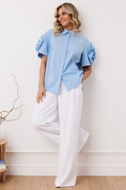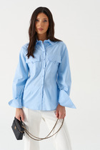 Горловина круглой формы с рубашечным воротником. Плечо спущено, пройма углублена. Рукав втачной, короткий. Низ рубашки прямой.