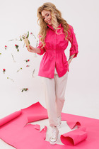Блузка женская прямого силуэта из сатиновой ткани. Горловина круглой формы, в горловину втачан стояче-отложной воротник. Центральная застежка на пуговицы.