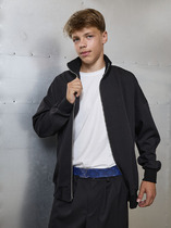 Бомбер свободного кроя. Круглый вырез горловины. В горловину втачан воротник-стойка из рибаны. Шов втачивания закрыт х/б тесьмой 10мм ,10TGY-O. Спереди застежка на кнопки 15 мм .Плечо спущено, пройма углубленна. Рукава втачные, длинные. По низу рукавов манжеты из рибаны. На деталях переда  прорезные карманы . По низу изделия отрезной пояс из рибаны.