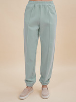 Брюки женские прямого силуэта из ткани. На деталях переда карманы с отрезным бочком. Пояс отрезной состоит из двух частей, задняя часть пояса присборена на резинку. Посадка средняя.