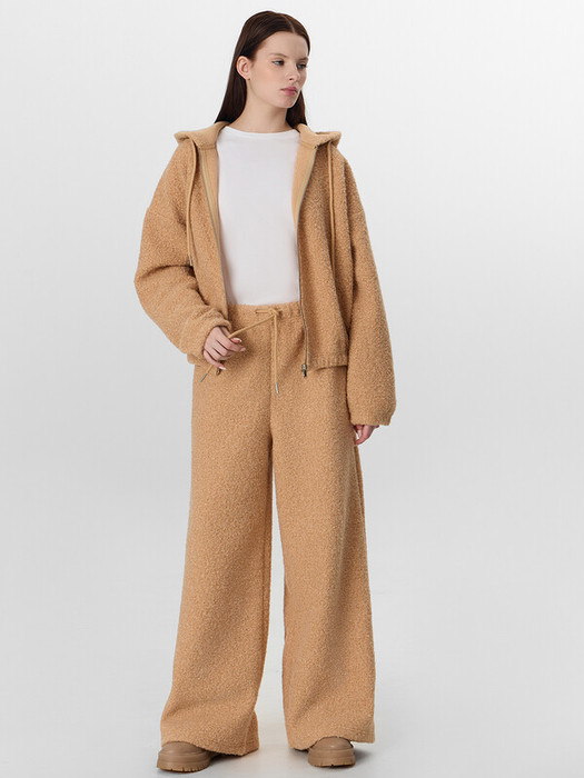 Брюки оверсайз, с цельнокроеным поясом. Внутри пояса резина 40RV и вставлен шнур с эглетом  8EKWC-1 8мм. В боковых швах карманы с кулирным полотном. Низ обработан швом вподгибку.