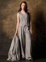 Брюки прямые, свободные. Посадка высокая.Пояс отрезной состоит из двух частей. Задняя часть с эластичной тесьмой внутри. В боковых швах обработаны карманы. На правой передней половинке проложена декоративная строчка - имитация гульфика. На передних и задних половинках заутюжены стрелки. Нижние срезы брюк обработаны швом вподгибку