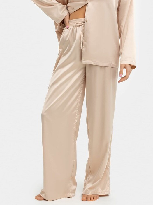 Брюки с посадкой на талии свободного силуэта. Пояс цельнокроеный с резиной внутри. По центру пояса настрочена завязка из основного полотна. Низ изделия застрочен швом в подгибку.