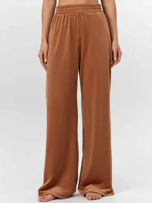 Мягкий велюр приятен к телу и обладает легким блеском. Широкий пояс со встроенной эластичной резинкой не давит на талию, а две отделочные строчки добавляют модели аккуратности. Удобные карманы в боковых швах практичны для хранения мелочей.