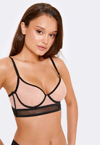 Бюстье женское. Передняя и задняя детали выполнены из кружевного полотна. Горловина и проймы обработаны ловаблем. Нижний срез обработан тесьмой.