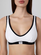 Бюстгальтер мягкий  из эластичной сетки, без каркасов. Чашка с вытачкой. Низ обработан широкой бейкой из основного полотна с эластичной тесьмой внутри, с отделочной строчкой контрастными текстурированными нитками. Передний срез и проймы чашки обработаны с контрастной строчкой текстурированными нитями и жилкой по изнаночной стороне. Передняя часть бретели выворотная из основного полотна с жилкой внутри. Надставки бретелей по спинке из бретелечной тесьмы  с регулировкой. Кольца-регуляторы. Застежка двойная.