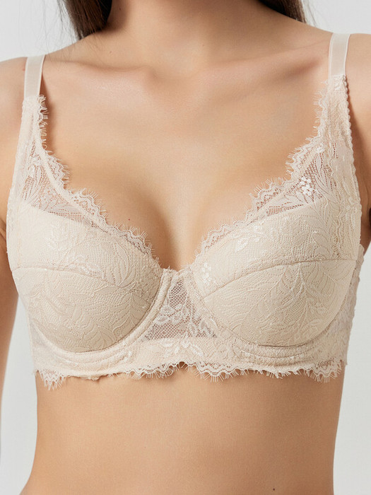 Бюстгальтер макси, каркас 85 тип, из эластичного кружева. Верхняя деталь чашки из эластичного кружева с тройным членением, отлетная по верхнему краю. С изнаночной стороны настрочена эластичная тесьма 4 мм (жилка тканая Wt4-4, девсел 13460W). Нижняя деталь чашки с тройным членением из дубляжа.