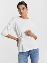 Джемпер прямого силуэта, свободный. Горловина V-образной формы, глубокая, обработана бейкой из основного полотна. Рукава втачные, корткие. Нижние срезы джемпера и рукавов обработаны швом вподгибку.