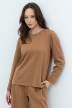 Уютный джемпер свободного кроя из плотного трикотажного полотна - интерлока с отделочными деталями из ткани - поплина. Отделочные детали имитируют выправленную из-под низа изделия рубашку. В боковых швах выполнены разрезы. Горловина обработана отделочным элементом - стояче-отложным воротником с отрезной стойкой. Воротник выполнен из отделочного полотна. На передней детали есть застежка-планка на три рубашечных пуговицы на два прокола на застежке-планке. Плечо спущено, пройма углублена, рукав втачной длинный с манжетами. Стильная и комфортная модель для создания оригинальных образов на каждый день!