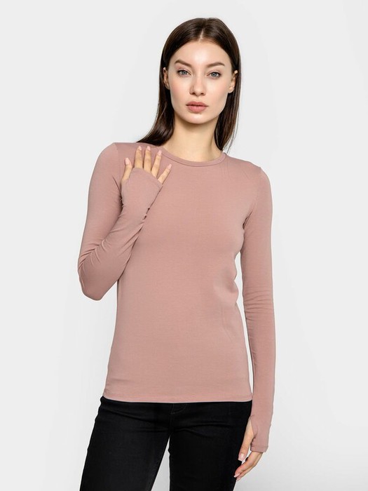 Горловина круглой формы, с обтачкой из основного полотна. Шов горловины спикни окантован бейкой из оснвоного оплотна. Рукав втачной длинный, по низу в шве обработан разрез для пальца. Джемпер удлинен.