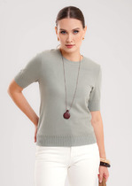Материал с добавлением люрекса создает мягкое мерцание, которое привлекает внимание и переливается при движении. Круглая горловина аккуратно обработана бейкой, что обеспечивает аккуратный и прочный край.