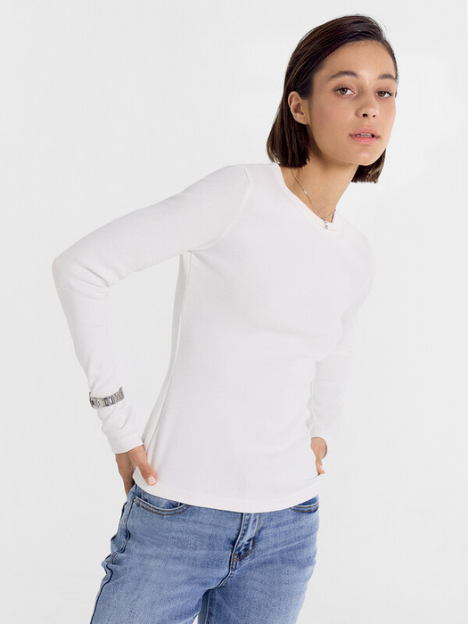 Джемпер женский прилегающего силуэта из трикотажного плотна рибана. Горловина круглой формы, окантована бейкой из рибаны. Рукав втачной, длинный, узкий. Нижние срезы обработаны швом вподгибку.