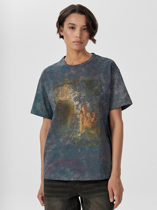 Футболка прямая, свободная. Горловина круглой формы обработана бейкой в 3 сложения из основного полотна. Рукава втачные, корткие. Нижние срезы футболки и рукавов обработаны швом вподгибку.