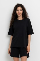 Нижний срез футболки и рукавов обработан швом вподгибку.