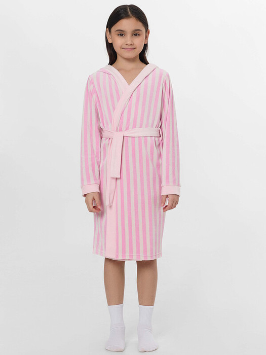 Халат для девочек, для отдыха изготовлен из велюра. Силуэт прямой, длина ниже коленей. Халат с запахом, с капюшоном, с съемным поясом, продетым в шлевки в боковых швах. Концы пояса свободно завязываются. В боковых швах обработаны карманы. Рукава длинные с манжетами, втачены в открытые проймы. Спинка цельнокроеная. По срезам борта и капюшона притачена планка. Низ изделия застрочен на 2-хигольной плоскошовной машине. По срезу втачивания капюшона настрочена тесьма и вешалка из бейки из велюра.