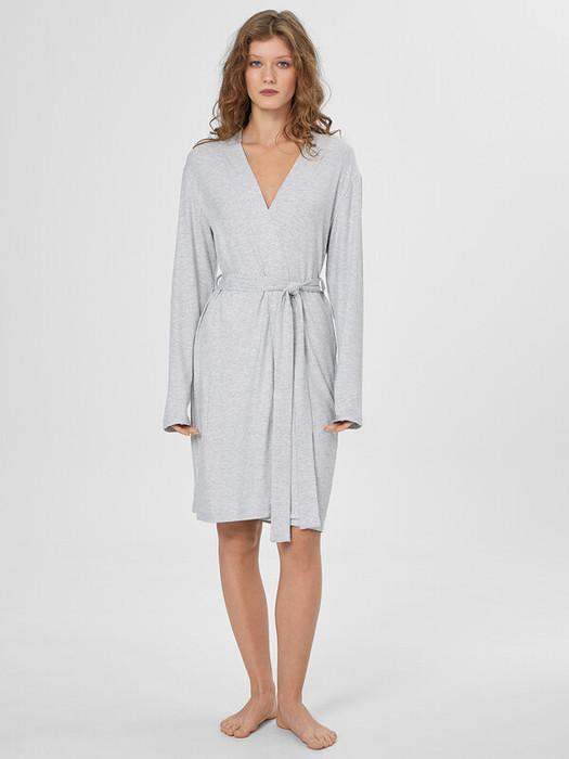Халат прямой, короткий. Горловина V-образной формы. Рукава втачные длинные. По боковым швам в районе талии настрочены шлевки и вставлен пояс из основного полотна. На уровне талии притачаны завязки из основного полотна для фиксации полы халата. Срезы борта и горловины обработаны обтачками. Нижние срезы халата и рукавов обработаны швом вподгибку.