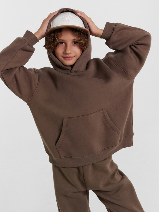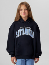 Худи для мальчиков, свободного силуэта (оверсайз), с капюшоном. Горловина округлой формы. Капюшон со средним швом, на подкладке из основного полотна. Шов втачивания капюшона закрыт хб тесьмой. Плечо спущено, рукав втачной длинный. По низу рукава отрезная манжета из рибаны. Пояс отрезной из рибаны, отстрочен. По переду карман кенгуру.
