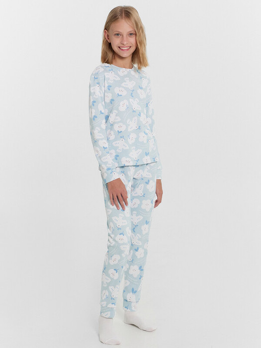 Уютный комплект для девочек, состоящий из джемпера с длинными рукавами и брюк. Джемпер свободного силуэта. Перед и спинка цельнокроеные. Горловина круглой формы из основного полотна. Рукава втачные, низ рукавов с притачными манжетами. Брюки прямые, с притачными манжетами. Пояс с эластичной тесьмой, которая обеспечивает отличную посадку. Стильная и комфортная детская пижама — лучший вариант для прохладного времени года. Широкий размерный ряд, красивые расцветки моделей в линейке. Рекомендуем!