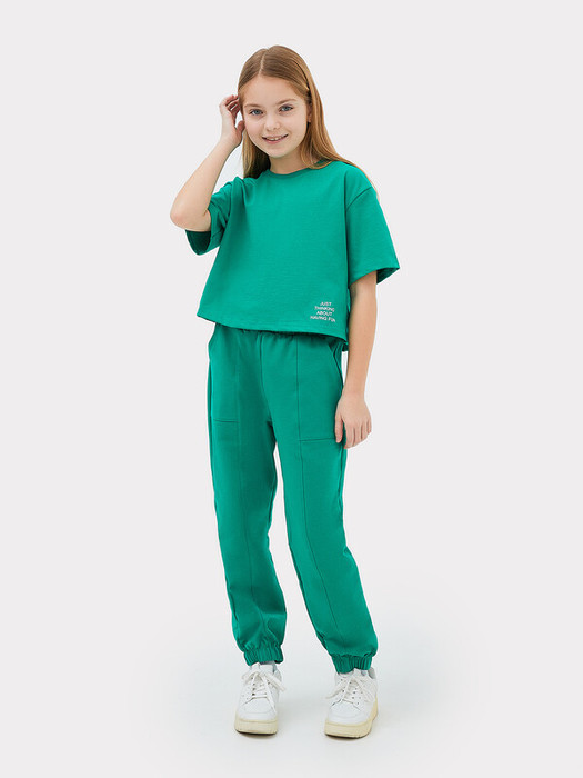 Универсальный комплект для девочек состоит из футболки и брюк. Футболка из кулирного полотна, укороченная, прямого силуэта. Линия плеча спущена. Рукав втачной, короткий. Горловина круглой формы из рибаны. Брюки прямого силуэта из футера. Посадка высокая. Отрезной пояс с эластичной тесьмой внутри. На передних половинках выполнены накладные карманы. Стильная, а главное удобная модель, которая точно понравится вашей малышке. Натуральный материал изделия гарантирует комфорт в любой ситуации. Широкий размерный и цветовой ряд. Рекомендуем!