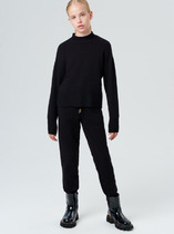 Рукава длинные. Линия плеча спущена. Горловина обработана обтачкой из рибаны. По низу рукавов и джемпера притачены манжеты и пояс из рибаны Брюкид для девочек свободного силуэта. Пояс отрезной из основного полотна с эластичной тесьмой внутри 50RV. По поясу проложены отделочные строчки. Низ брюк обработан швом в подгибку.