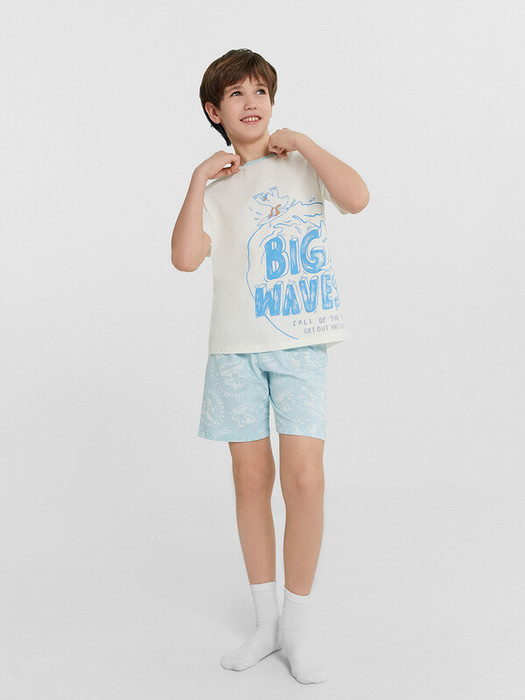 Пижама для мальчиков. Выполнена из хлопкового трикотажа кулирного переплетения. Комплект включает футболку и шорты. Футболка свободная, с круглой горловиной и короткими рукавами. Шорты длиной до колен, с эластичной тесьмой в поясе. Отличный комплект для сна и отдыха!