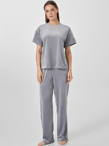 Брюки прямые длинные. Посадка срердняя. Пояс цельнокроеный с эластичной тесьмой внутри (внутр. 20мм 20Rv). Нижние срезы брюк и блузы обработаны швом вподгибку с закрытым срезом.
